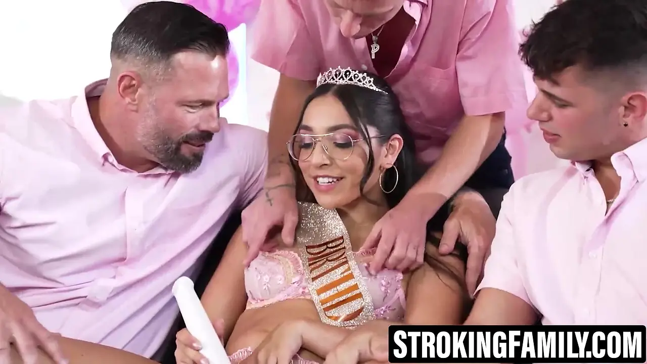 Beautiful teen Madison Wilde gets gangbanged by three big-dicked studs on her birthday. She sucks their cocks, rides them rough in cowgirl, and gets her pussy licked and fingered. The guys cum all over her face, and she strokes her natural perky tits.