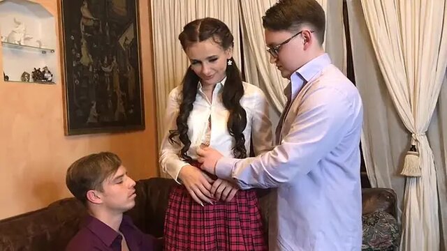 Two teenage boys invite their skinny classmate over for a threesome. She sucks their small dicks before they both fuck her petite pussy and small tits. They blast their cum on her face and she swallows it eagerly.